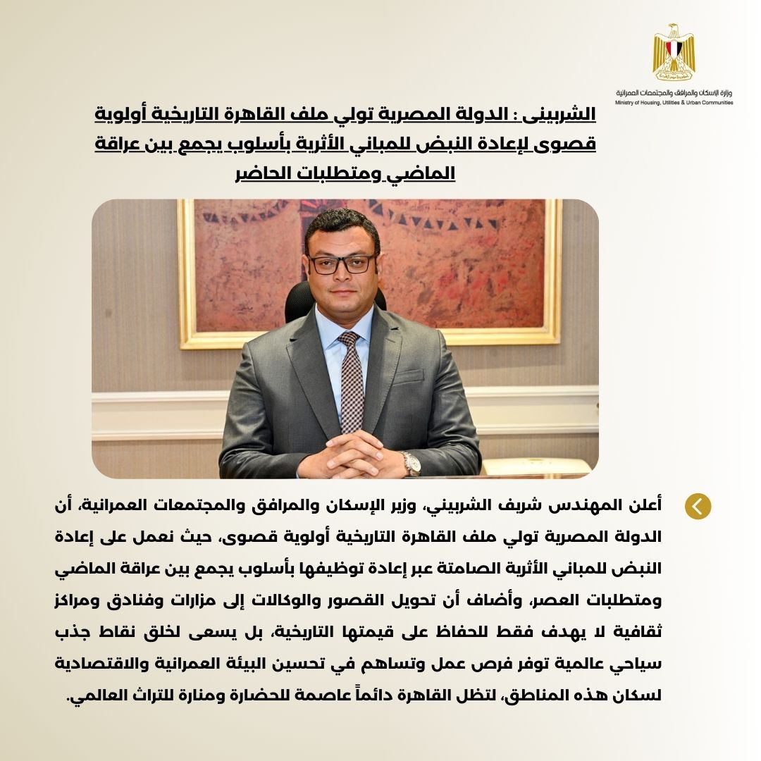 وصرح المهندس شريف الشربيني، وزير الإسكان والمرافق والمجتمعات العمرانية، قائلاً: “إن الدولة المصرية تولي ملف القاهرة التاريخية أولوية قصوى، حيث نعمل على إعادة النبض للمباني الأثرية الصامتة عبر إعادة توظيفها بأسلوب يجمع بين عراقة الماضي ومتطلبات العصر، إن تحويل القصور والوكالات إلى مزارات وفنادق ومراكز ثقافية لا يهدف فقط للحفاظ على قيمتها التاريخية، بل يسعى لخلق نقاط جذب سياحي عالمية توفر فرص عمل وتساهم في تحسين البيئة العمرانية والاقتصادية لسكان هذه المناطق، لتظل القاهرة دائماً عاصمة للحضارة ومنارة للتراث العالمي”.
