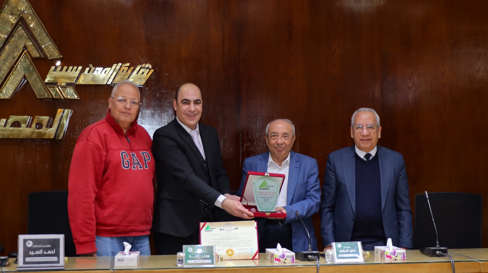 على هامش تكريم أوائل خريجي برنامج PMP الحاصلين على الشهادة الدولية وأوائل خريجي البرنامج الثاني من دورة CAPM كرم كل من المهندس طارق النبراوي- نقيب مهندسي مصر ورئيس اتحاد المهندسين العرب، والمهندس محمود عرفات- أمين عام النقابة، والأستاذ الدكتور المهندس معتز طلبة- أمين الصندوق، والمهندس الاستشاري أحمد السيد المحاضر الدولي المعتمد لبرنامج إدارة المشاريع الاحترافية بالنقابة، عدد من المهندسين بالنقابة والكوادر الإدارية بنقابة المهندسين المصرية القائمين على تنظيم البرنامجين، تقديرًا لجهودهم المتميزة المبذولة للخروج بتنظيم البرنامجين بصورة مشرفة تليق بمكانة المهندسين المصريين.